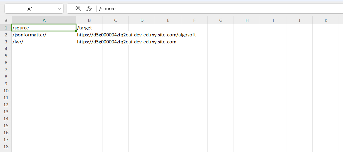5) Save the CSV file and Upload into the URL Redirect tab in Community.